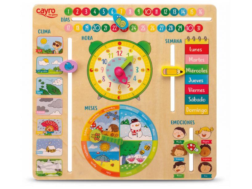 ¡Completa la habitación de los peques con el panel más útil y completo! ¡Gracias a este genial Calendario de Madera de Cayro!Consigue este práctico calendario fabricado con madera ligera y resistente, con diseño de colores e indicadores muy divertidos y prácticos para el aprendizaje de los peques. Podrán marcar el día en el que se encuentran con el caracol, el clima de cada día con el pajarito, el mes del año con la mariposa, el día de la semana con el lápiz y finalmente las emociones con la seta.Edad recomendada: De 3 a 10 años.Colección: Cayro.Incluye: 1 caja de almacenaje y 1 calendario de madera con indicador manual de días, horas, meses, semanas, emociones y clima.Medidas aproximadas del calendario: 30 cm de largo, 30 cm de ancho y 3,7 cm de fondo.Medidas aproximadas de la caja de almacenaje: 30,5 cm de largo, 30,5 cm de ancho y 4 cm de fondo.