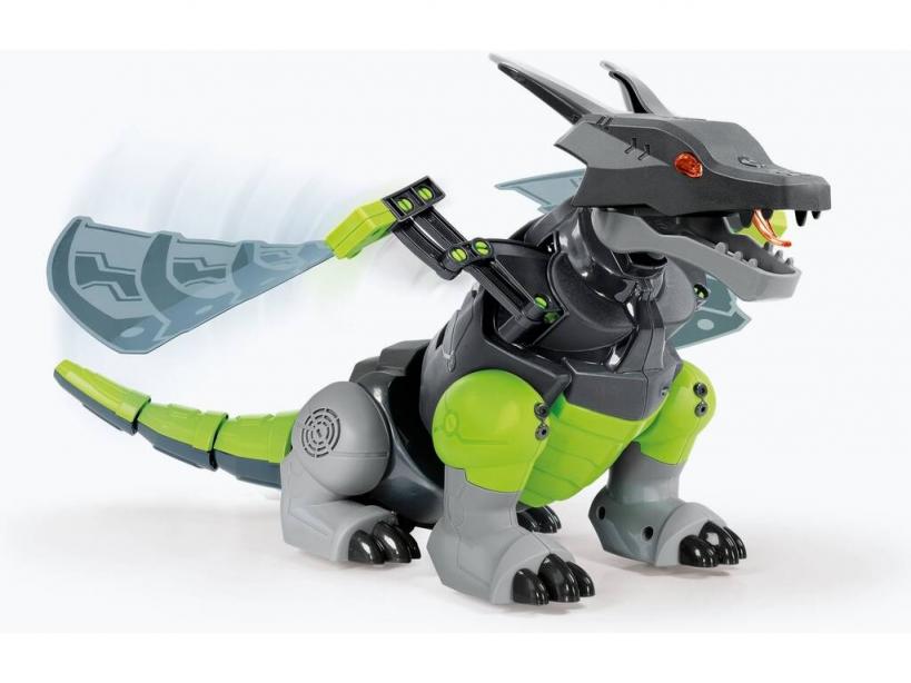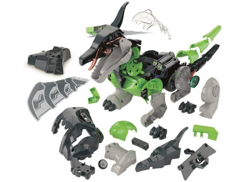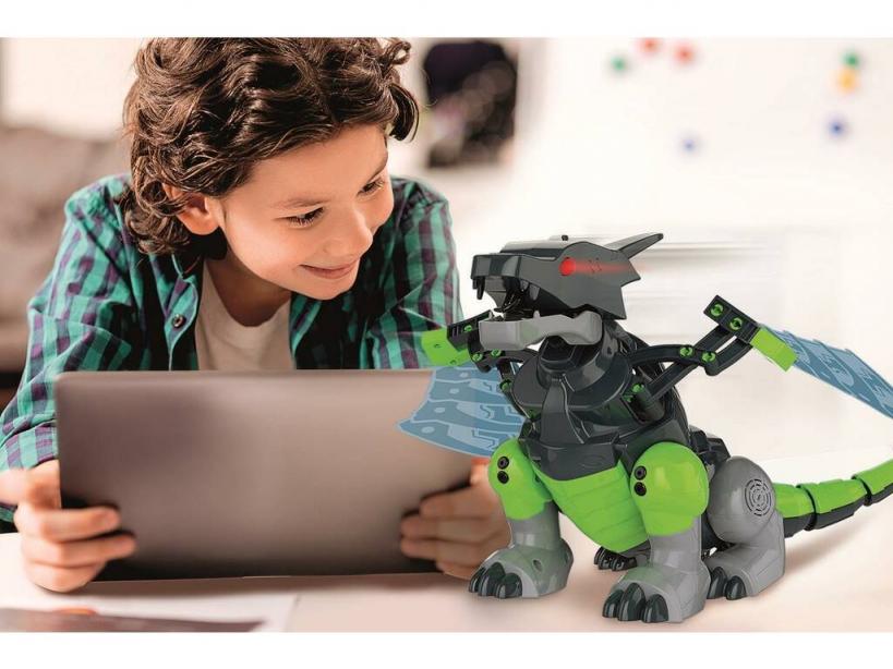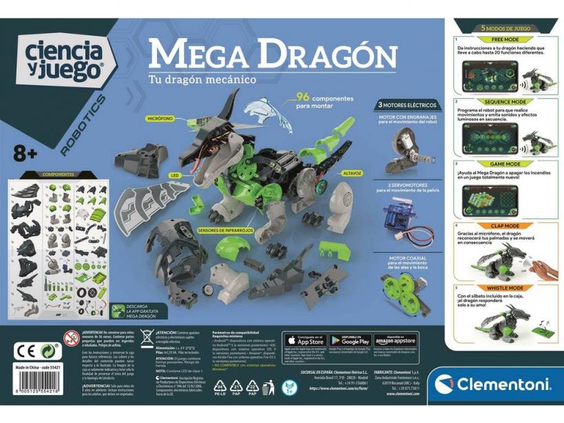 ¡Crea tu propio dragón y haz que cobre vida de la forma más divertida! ¡Llévate a casa el nuevo Mega Dragón de Clementoni!Hazte con este increíble set de robótica con el que construir un impresionante dragón, con función a motor, 5 modos de juego y muchas otras sorpresas de lo más ingeniosas y creativas. Un dragón que podrás programar a través de tus dispositivos móviles (no incluidos), con solo descargar la app gratuita y hacer uso de la misma.Une todas las piezas hasta crear este increíble ser, una vez construido podrás jugar en modo Clap Mode, se moverá gracias a tus palmadas; en Whistle Mode responde solo tras oír el silbato de su amigo; en Free Mode con tu dispositivo podrás dar instrucciones y tienes hasta 20 funciones diferentes; en Sequence Mode para programar movimientos, sonidos y secuencias luminosas; y por último Game Mode, donde ayudarás al dragón a apagar incendios en un juego para tu dispositivo móvil.Importante: Instrucciones en castellano.Edad recomendada: + 8 años.Número de jugadores: 1 o más jugadores.Incluye: 1 dragón mecánico Mega Dragón construible con led bicolor, micrófono para comandos sonoros, boca móvil, 2 sensores de infrarrojos, 3 motores eléctricos (1 motor coaxial para boca y alas y 2 motores para el movimiento de pelvis), alas móviles, colar articulada y altavoz para efectos sonoros.Número total de componentes: 96 componentes para su creación.Longitud aproximada del dragón: 44 cm.Medidas aproximadas de la caja de almacenaje: 30,5 cm de alto, 45 cm de ancho y 7 cm de fondo.Funciona con 4 pilas «AA» (no incluidas)Puede encontrar las pilas y baterías