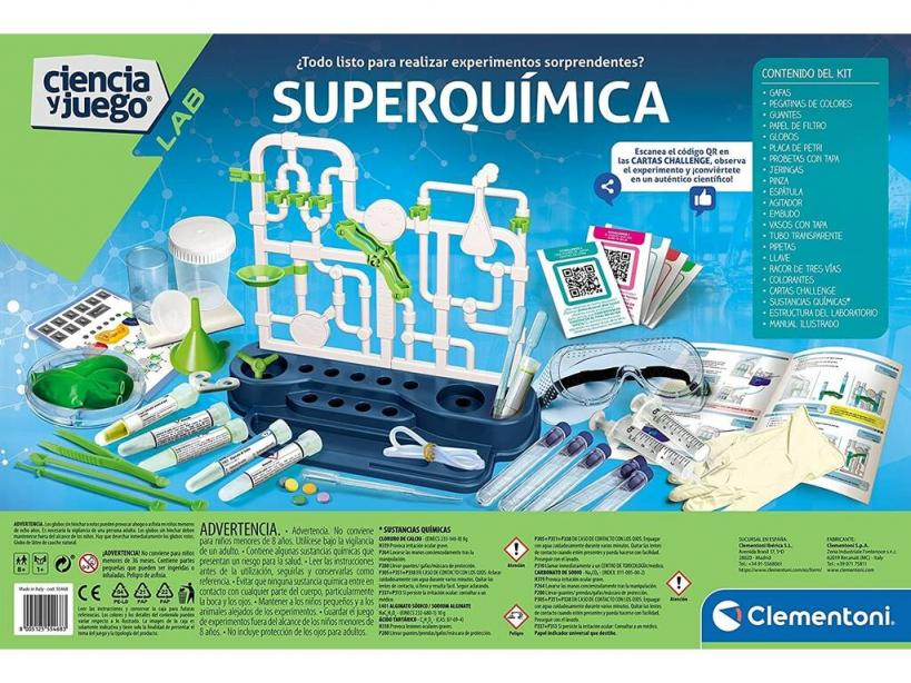 ¡Realiza los experimentos químicos más seguros y sorprendentes! ¡Gracias a este Superquímica de Clementoni!Hazte con este nuevo kit lleno de accesorios con los que realizar los experimentos de química más alucinantes. Crea tu propio laboratorio en casa y descubre los secretos de la química, disfruta de experimentos con diferentes puntos de dificultad, utilizando sustancias seguras y certificadas.¡Escanea los códigos QR de las cartas Challenge para observar los experimentos antes de realizarlos! ¡El regalo ideal para los peques más inquietos e investigadores!Artículo fabricado en Italia.Edad recomendada: 8 años o más.Número de jugadores: 1 o más jugadores.Colección: Ciencia y Juego.Incluye: Caja de almacenaje, gafas, pegatinas de colores, guantes, papel de filtro, globos, placa de Petri, probetas con tapa, jeringas, pinza, espátula, agitador, embudo, vasos con tapa, tubo transparente, pipetas, llave, racor de tres vías, colorantes, cartas challenge, sustancias químicas (clorudo de calcio, alginato sódico y ácido tartárico), estructura de laboratorio y manual ilustrado.Medidas aproximadas de la caja de almacenaje: 36 cm de alto, 53 cm de ancho y 9 cm de fondo.