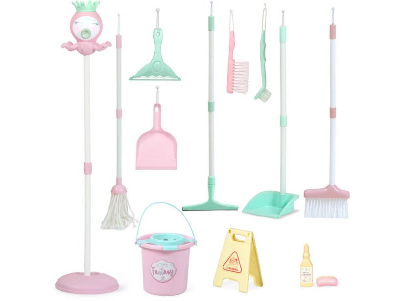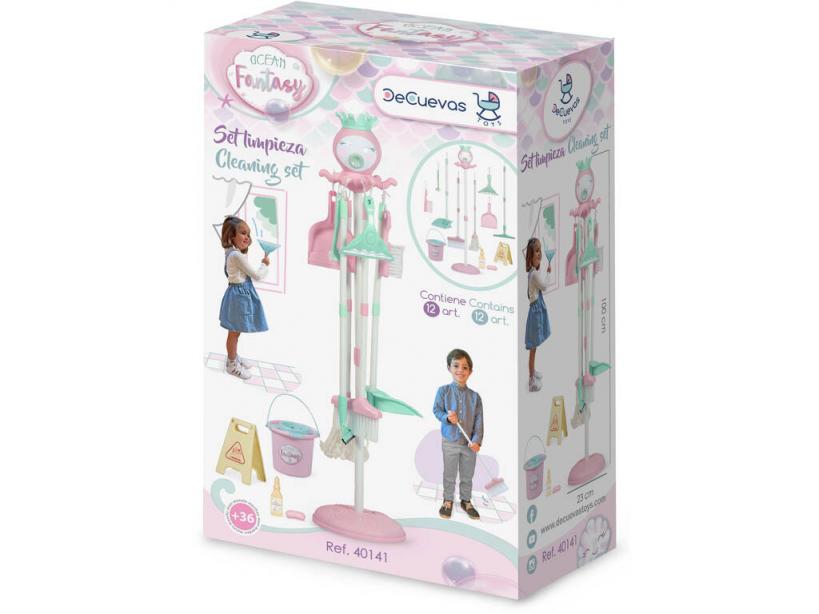 ¡Hora de limpiar y dejar la casa como los chorros del oro! ¡Junto al nuevo y completo Set de Limpieza con 12 Accesorios Ocean Fantasy de DeCuevas!Hazte con este impresionante set de limpieza que incluye todo lo necesario para que los peques jueguen a limpiar su habitación. Un set que incluye una pieza principal, sobre la que colgar de forma ordenada casi todos los accesorios. ¡El regalo ideal para el juego de imitación y educativo en casa!Importante: Accesorios extra no incluidos en el pack, se venden por separado.Edad recomendada: + 3 años.Incluye: 1 set de limpieza rosa y blanco con pulpito, 1 cubo para fregona, 1 fregona, 1 limpiacristales, 1 recogedor de mano, 1 recogedor con palo, 1 cepillo con palo, 1 cepillo de mano rosa, 1 cepillo de mano turquesa, 1 señal de advertencia, 1 bote y más accesorios de juego.Colección: Ocean Fantasy de DeCuevas.Medidas aproximadas del set de limpieza: 100 cm de largo, 23 cm de ancho y 23 cm de fondo.Peso aproximado del artículo: 1 kg.