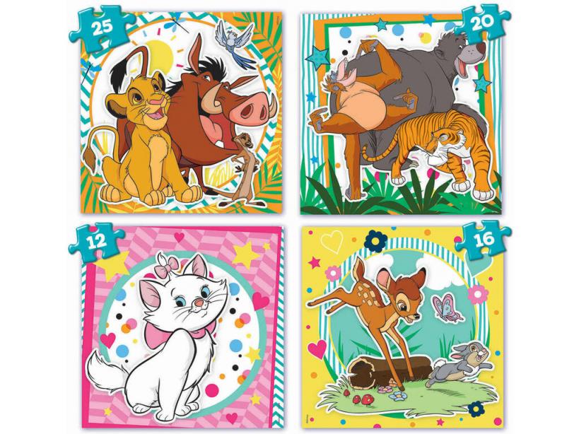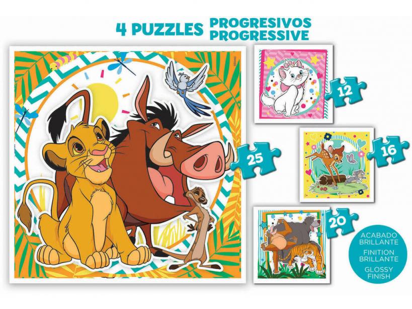 ¡Revive algunos de los momentos más divertidos de tus películas animadas preferidas! ¡Gracias a este Puzzle Disney Animals Progresivos 12-16-20-25 de Educa!Consigue este nuevo pack que incluye un práctico maletín de plástico, donde transportar y almacenar tus nuevas creaciones. Hasta 4 puzzles a todo color, con imágenes de algunas de las películas más populares de Disney.Artículo fabricado en España.Edad recomendada: De 3 a 5 años.Colección: Disney Animals.Incluye: 1 maletín porta puzzles de color azul con cierres de seguridad, 1 puzzle con la imagen de Simba, Timón y Pumba, 1 puzzle con la imagen de Bambie y tambor, 1 puzzle con la imagen de Baloo, Ray Louie y Shere Khan y 1 puzzle con la imagen de Marie.Medidas aproximadas de cada puzzle: 16 cm de largo y 16 cm de ancho.Medidas aproximaras del maletín: 25 cm de alto, 25 cm de ancho y 6 cm de fondo.
