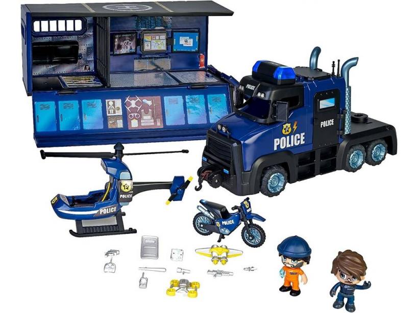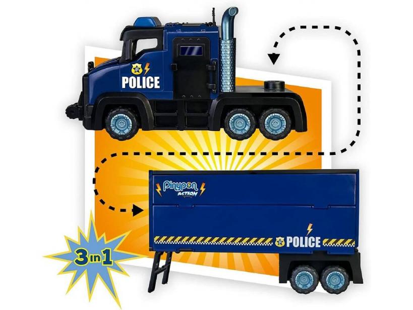 ¡Todo listo para la aventura más completa y genial junto a tus figuras preferidas! ¡Al llevarte el Pinypon Action Súper Camión de Policía con Figuras y Accesorios de Famosa!Hazte con este alucinante pack y disfruta de una misión sin igual junto al policía de los SWAT y todo su arsenal de accesorios y vehículos. Trata de atrapar al misterioso preso con el brazo azul, utiliza todos los medios disponibles para una persecución de cine y vuelve a transportarlo a su lugar de origen. ¡Sorprende a los más peques con el pack de acción definitivo! ¡Amplia la aventura con el resto de sus artículos Pinypon Action!Importante: Figuras extra no incluidas en el pack, se venden por separado.Edad recomendada: 4 años o más.Colección: Pinypon Action.Incluye: 1 figura articulada Pinypon SWAT con doble cara, 1 figura articulada Pinypon preso con doble cara, 1 camión con espacio para figura en cabina y remolque convertible en oficina de operaciones, 1 moto de policía, 1 helicóptero de policía, 1 drone, 1 escudo, 1 porra, 1 linterna y muchos más accesorios de juego.Medidas aproximadas de cada figura: 7 cm de alto, 4 cm de ancho y 3,5 cm de fondo.Medidas aproximadas del camión completo: 21 cm de alto y 64 cm de largo.