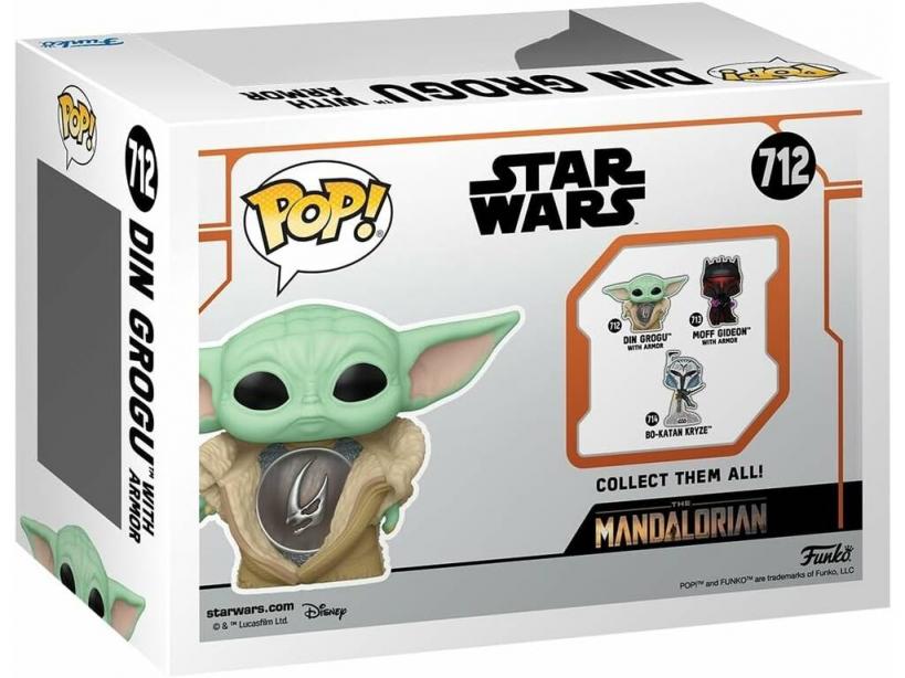 ¡El pequeño Grogu vuelve y lo hace con un look preparado para la acción! ¡Descubre y disfruta del nuevo Funko Pop Star Wars Figura Din Grogu con Armadura y Cabeza Oscilante!Consigue este genial Funko del pequeño Baby Yoda, tras su reencuentro con los mandalorianos, Grogu vuelve con una armadura muy especial. Disfruta de su nuevo look gracias a este Funko de colección con base especial, cabeza oscilante y muchos más detalles geniales.Edad recomendada: 3 años o más.Edición: Pop!Colección: Star Wars The Mandalorian.Número: 712.Incluye: 1 figura coleccionable de vinilo de Grogu con cabeza oscilante, armadura, abrigo abierto y base especial de color negra con logo de Star Wars y 1 caja de almacenaje y exposición con diseño especial de la figura.Medidas aproximadas de la figura: 9 cm de alto, 13 cm de ancho y 6 cm de fondo.Medidas aproximadas de la caja de almacenaje y exposición: 11,5 cm de alto, 16 cm de ancho y 9 cm de fondo.