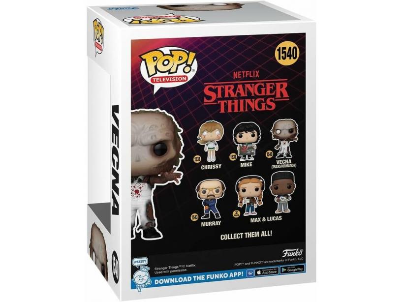 ¡Vuelve el Sujeto 001 y lo hace con un aspecto de lo más imponente! ¡No dejes escapar el nuevo y genial Funko Pop Television Stranger Things Figura Vecna!Hazte con esta sorprendente y esperada figura de colección de Vecna, el nuevo villano en la Temporada Cuatro de la exitosa serie de Netflix Stranger Things. Una figura que no puede faltar en tu colección más especial de Funkos, con detalles alucinantes que ponen la piel de gallina.Edad recomendada: 3 años o más.Edición: Pop! Television.Colección: Stranger Things.Número: 1540.Incluye: 1 figura coleccionable de vinilo de Vecna con uniforme de color blanco roto y ensangrentado, rostro deteriorado y pose de acción y 1 caja de almacenaje y exposición con diseño especial de la figura.Medidas aproximadas de la figura Vecna: 9 cm de alto, 6 cm de ancho y 5,5 cm de fondo.Medidas aproximadas de la caja de almacenaje y exposición: 16 cm de alto, 11 cm de ancho y 9 cm de fondo.