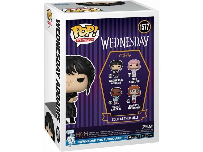 ¡Disfruta al ritmo de Miércoles Addams! ¡Gracias a esta nueva Funko Pop Television Wednesday Figura Wednesday Addams!Revive uno de los momentos más icónicos de la serie del momento, disfruta de esta genial figura de vinilo de Miércoles bailando, con su ya icónico vestido del baile y una base especial para exponerla.¡Una gran variedad de Funkos de tus personajes preferidos de la serie Wednesday te esperan en nuestro amplio surtido web! ¡Hazte con la colección al completo y disfruta de tu pasión por las figuras coleccionables al mejor precio!Edad recomendada: 3 años o más.Edición: Funko Pop! Television.Colección: Wednesday.Número: 1577.Incluye: 1 figura de colección Wednesday Addams con pose especial de baile, vestido negro, uñas negras y muchos más detalles geniales, 1 base redonda para la figura y 1 caja de almacenaje y exposición con diseño especial.Medidas aproximadas de la figura: 10 cm de alto, 7 cm de ancho y 5,5 cm de fondo.Medidas aproximadas de la caja de almacenaje y exposición: 16 cm de alto, 11,5 cm de ancho y 9 cm de fondo.