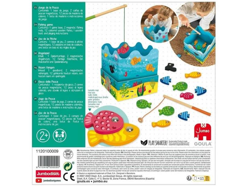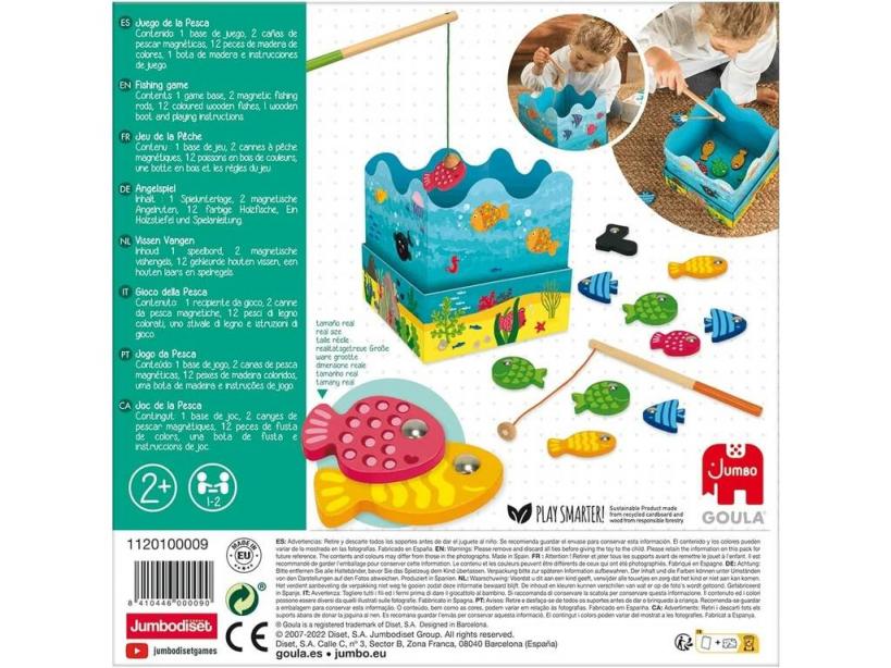 Quién conseguirá ser el mejor pescador Juego de la Pesca de Goula Este juego es perfecto para los peques de la casa. Cuenta con dos modalidades para que se diviertan. La primera modalidad, cada uno de los pescadores intentará conseguir cuántos más peces. Pero ¡Cuidado! si alguno de ellos por equivocación pesca la bota todos sus peces deberán devolverse al marLa segunda modalidad de juego, cada uno de los jugadores escogerá dos colores y deberá conseguir pescar los pececitos del color que haya escogido. ¡Hay que vigilar! si pescas la bota hay que devolver todos los peces al mar, y, si cogen el color que no les corresponde también¡Hazte ya con este alucinante juego y encuentra muchois más en nuestra página web!Edad recomendada: 2 años o másIncluye:1 caja de almacenaje ilustrada, 1 base de juego, 2 cañas de pescar magnéticas, 12 peces de madera de colores, 1 bota de madera e instrucciones de juegoMedidas aproximadas de las fichas de madera: 3,5 cm de alto x 3,5 cm de anchoNúmero total de jugadores: 2- 4 jugadoresTiempo de duración: 10 minutos