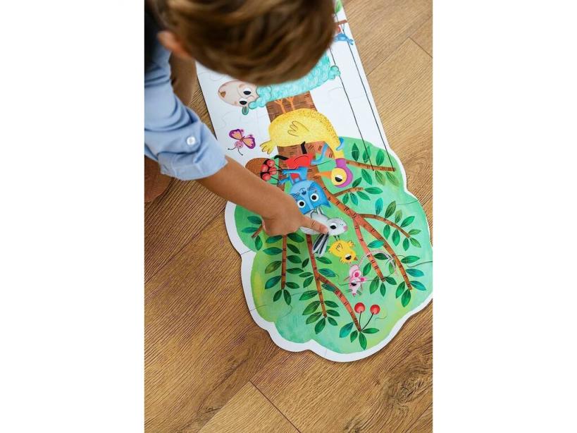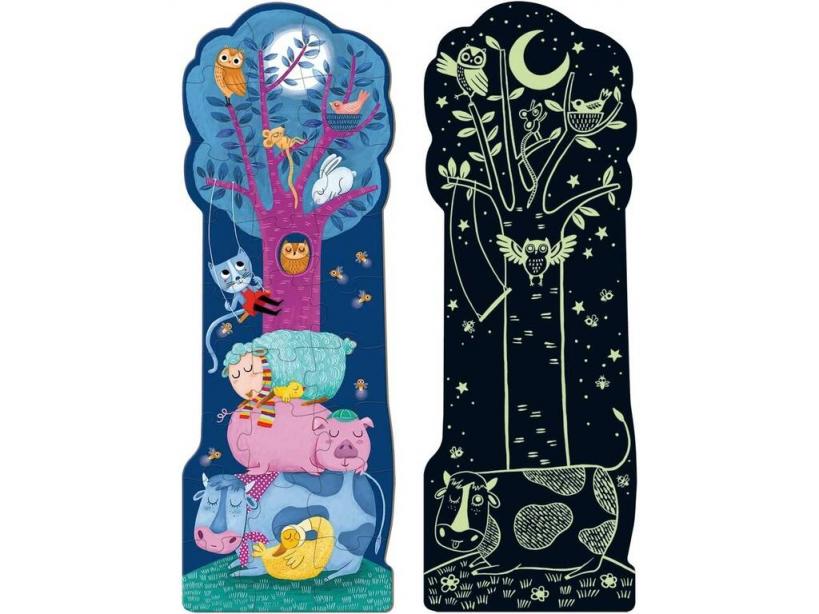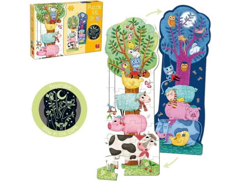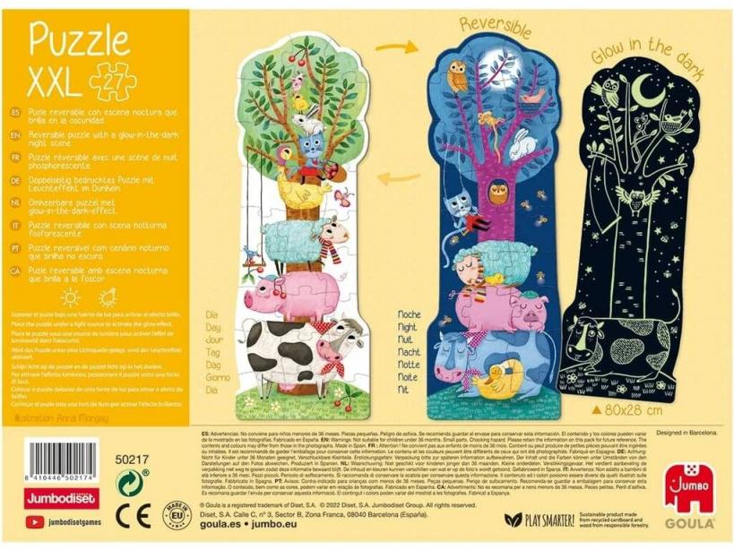 ¡Explora tu creatividad e imaginación! Junto este Puzzle XXL Reversible Con Luz de Goula Este rompecabezas de dos caras presenta una una alucinante imágen de los animales más conocidos. En la cara diurna, nos encontramos a los animales más famosos del campo subiendo un árbol como la vaca, la oveja, el cerdo, el conejo y muchos otros más . Del lado nocturno, las criaturas duermen plácidamente mientras el búho posa en el árbol y las luciérnagas vuelan. ¡Hazte ya con este práctico rompecabezas! ¡El puzzle de escena nocturna brilla en la oscuridad!. Pon la creación en una fuente de luz para activar el efecto brillo. Fabricado en España Edad recomendada: 3 años o másIncluye: 1 caja de almacenaje ilustrada ,1 puzzle ilustrado reversible con escena noctruna que brilla en la oscuridadNúmero total de piezas: 27 piezasMedidas aproximadas del puzzle: 80 cm de alto x 28 cm de anchoMedidas aproximadas de cada pieza: 9 cm de alto x 8 cm de anchoIlustraciones hechas por: Anna Monday