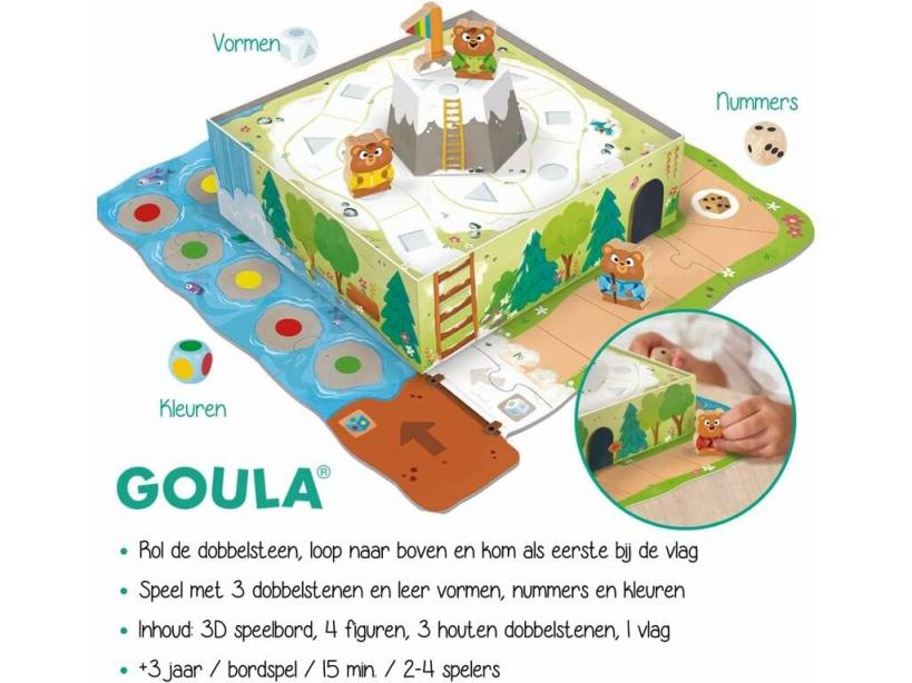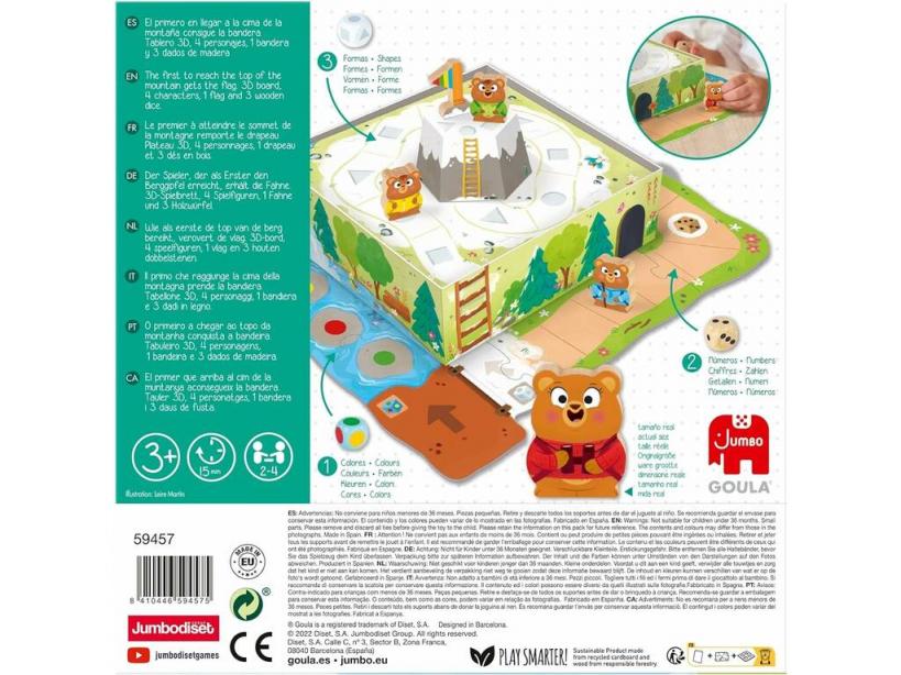 ¡Llega hasta el final del tablero y atrapa la bandera! ¡Disfruta junto a los peques de este genial juego de mesa Goula Juego Bear Adventure de Madera de Diset!Consigue este nuevo juego de mesa y disfruta de la carrera más genial entre divertidos ositos. Un juego con piezas de madera, tablero en tres dimensiones y muchas sorpresas que encantarán a los más peques de la casa. Solo hay que lanzar los dados y avanzar por el tablero hasta llegar a la bandera.Edad recomendada: 3 años o más.Colección: Jumbo de Goula.Incluye: 1 1 caja de almacenaje que se convierte en parte del tablero de juego en 3D, 4 fichas de personajes de ositos, 1 bandera y 3 dados de madera diferentes.Medidas aproximadas de la caja de almacenaje: 23 cm de alto, 23 cm de ancho y 6,5 cm de largo.Medidas aproximadas de cada ficha de osito: 4,5 cm de alto y 3,3 cm de ancho.