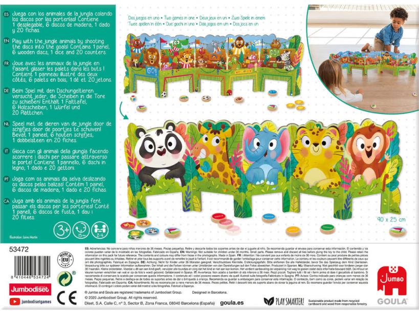 ¡Descubre la jungla más divertida y a todos sus animales! ¡Gracias al nuevo Jungle Race de Goula!Consigue este divertido juego infantil en el que los peques podrán colar los discos por las porterías. Ideal para jugar en el salón de casa, un juego de lo más inspirador, que ayuda a los peques a desarrollar habilidades a través del juego.Artículo fabricado en Europa.Edad recomendada: + 3 años.Número de jugadores: De 2 a 4 jugadores.Duración aproximada de cada partida: 15 minutos.Incluye: 1 caja de almacenaje ilustrada, 1 deplegable, 6 discos de madera, 1 dado de juego y 20 fichas.Medidas aproximadas del desplegable: 25 cm de alto y 90 cm de ancho.Medidas aproximadas de cada disco de madera: 4 cm de diámetro y 0,8 cm de alto.Medidas aproximadas de la caja de almacenaje: 22 cm de alto, 30 cm de ancho y 5 cm de fondo.