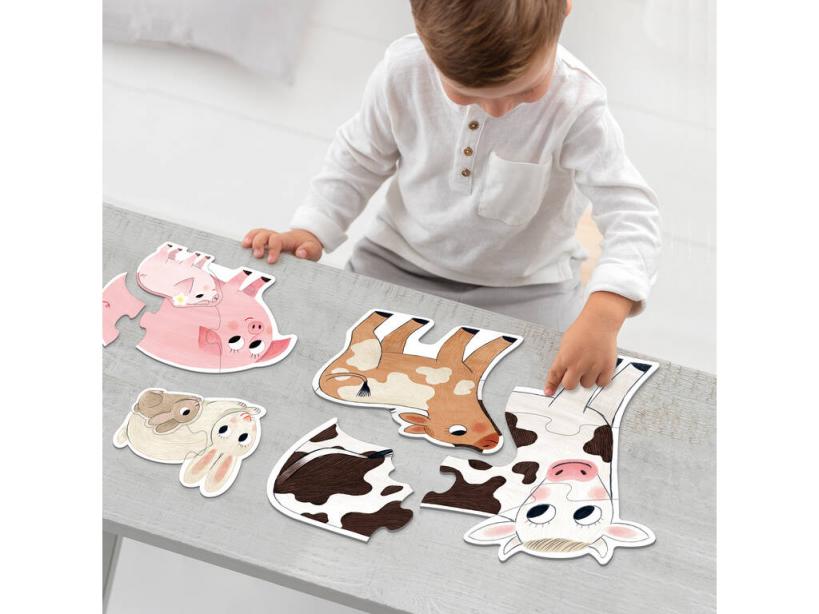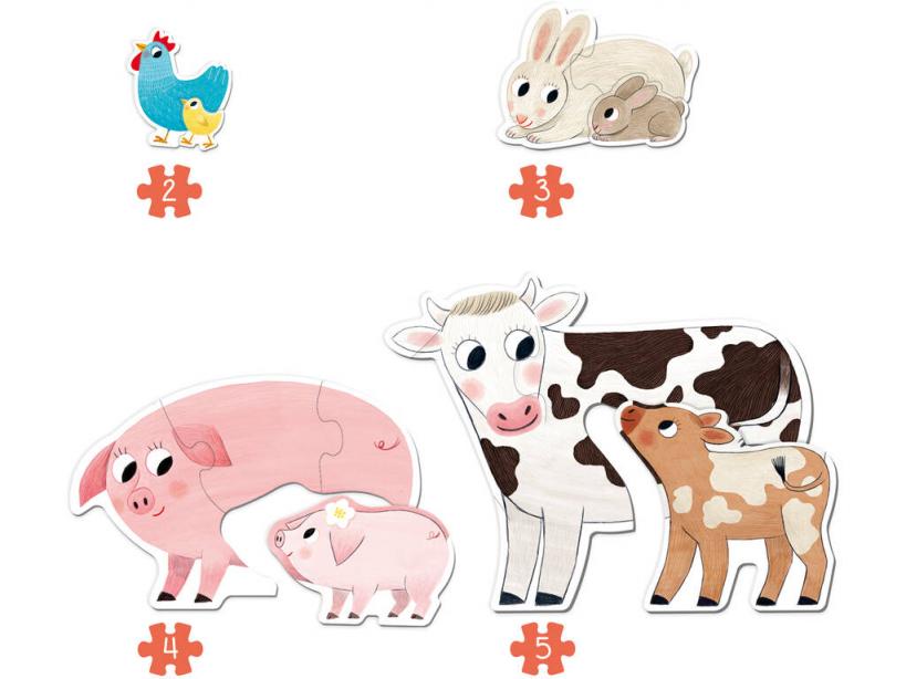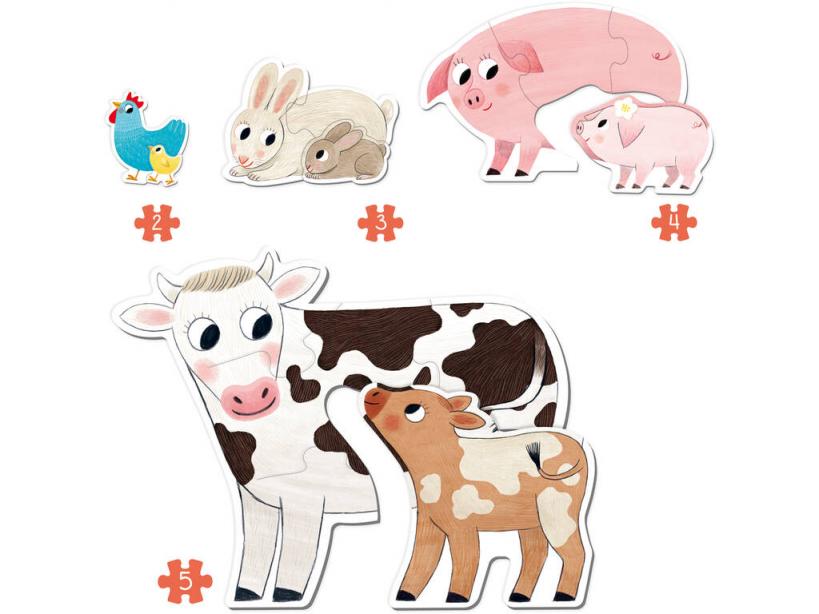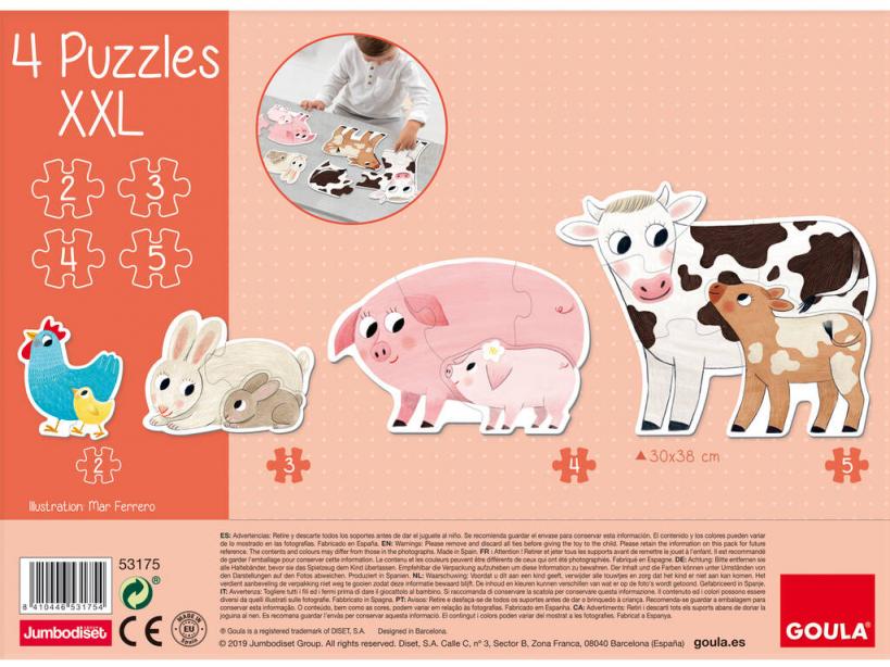 Diviertete creando con el Puzzle XXL Mamás y Bebés Goula 53175 y conociendo un poco mas las familias del mundo animal.En este llamativo producto podrás encontrar 4 distintos puzzles donde trabajar tus habilidades motrices básicas mientras te lo pasas en grande. Conocerás a la mamá gallina y su bebé donde se diviven en dos piezas, conocerás a la mamá conejo y su bebé que están divididos en tres piezas, a la mamá cerdo y su bebé que están divididos en 4 piezas y por ultimo a la mamá vaca y su bebé que si dividen en cinco piezas. Con cual emperása trabjar y disfrutar.Se trata del producto perfecto para comenzar a trabajar el desarrollo e ingenio de nuestros mas pequeños. Descubre las distintas posibilidades que podrás encontrar en nuestra web para ello.Edad recomendada: + de 2 años.Incluye: Una caja de almacenaje ilustrada y 4 Puzzles XXL Mamás y Bebés.Medidas aproximadas de la caja de almacenaje: 22 cm alto x 30 cm ancho x 5 cm fondo.Medidas aproximadas del Puzzle de la Vaca: 30 cm alto x 38 cm ancho.Fabricado en España.