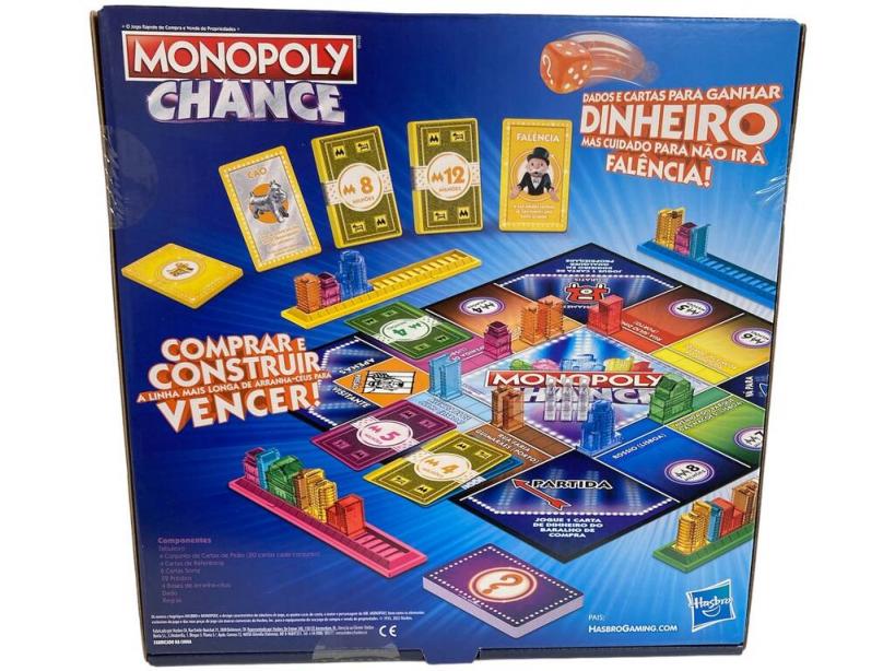 ¡Prepárate para una de las versiones más frenéticas de tu juego de mesa preferido! ¡Gracias al nuevo y genial Monopoly Chance en Portugués de Hasbro!Hazte con esta fantástica versión del Monopoly en portugués, juega y aprende con el juego de las Propiedades Inmobiliarias más genial. Partidas de 20 minutos aproximadamente, donde una jugada te puede hacer ganar mucho dinero, o perderlo todo de golpe.Importante: Juego en portugués.Colección: Monopoly de Hasbro Gaming.Edad recomendada: 8 años o más.Número de jugadores: De 2 a 4 jugadores.Duración aproximada de cada partida: 20 minutos aproximadamente.Incluye: 1 caja de almacenaje ilustrada, 1 tablero de juego, 4 mazos de Peón (20 cartas cada uno), 4 cartas de Referencia, 8 cartas de Suerte, 32 edificios, 4 soportes para edificios, 1 dado e instrucciones de juego.Medidas aproximadas de la caja de almacenaje: 26,5 cm de alto, 26,5 cm de ancho y 4 cm de fondo.