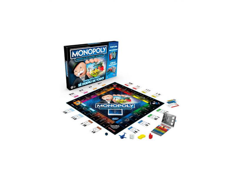 ¡Conviértete en la persona propietaria de todo comprando con tu tarjeta! ¡En el nuevo y vertiginoso Monopoly Súper Electronic Banking de Hasbro!Disfruta de esta nueva versión del magnífico juego de mesa de las propiedades, en el que el objetivo principal es ganar dinero y arruinar a tus contrincantes. Esta versión incluye una unidad bancaria electrónica y tarjetas, con las que podrás administrar tu partida. Sol has de tocar la unidad con tu tarjeta y disfruta de tu recompensa. También llevará la cuenta de tu fortuna, y solo tendrás que preocuparte en tu objetivo principal, convertirte en el dueño de todo.Importante: Juego en castellanoEdad recomendada: + 8 años.Número de jugadores: De 2 a 4 jugadores.Incluye: 1 caja de almacenaje ilustrada, 1 tablero de juego, 1 unidad bancaria electrónica, 4 peones de plástico, 4 tarjetas bancarias, 16 tarjetas de Título de Propiedad, 20 cartas de Suerte, 4 cartas de Referencia, 1 dado e instrucciones de juego.Medidas aproximadas de la caja de almacenaje: 26,5 cm de alto, 40 cm de ancho y 4,5 cm de fondo.La unidad bancaria funciona con 3 pilas «AAA» (no incluidas)Puede encontrar las pilas y baterías