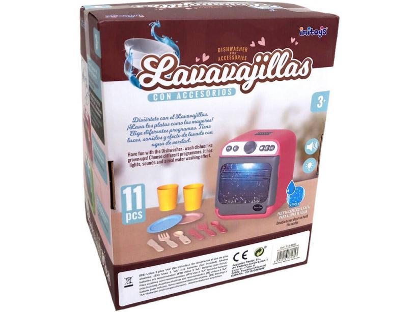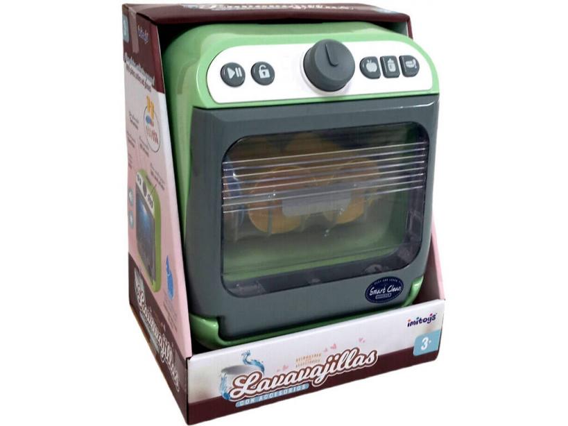 ¡Descubre una nueva forma de jugar llena de realismo y detalles que encantarán a los peques! ¡El nuevo Lavavajillas Verde con Agua, Luces, Sonidos y Accesorios!Disfruta del juego de imitación más genial junto a este nuevo lavavajillas de plástico ligero y resistente, con divertida función que simula lavado con agua de verdad y accesorios de lo más prácticos para jugar y sacarle el mayor partido posible.Solo tienes que llenar la puerta de agua, para lograr este efecto tan realista y divertido, que a los peques de la casa encantará durante el juego de imitación. Sin duda se trata de un juguete de gran calidad, fabricado con materiales muy resistentes y el diseño ideal para jugar en cualquier rincón de la casa.Edad recomendada: 3 años o más.Colección: Imitoys.Incluye: 1 lavavajillas de color verde y gris con botón de encendido, puerta con doble capa para alojar el agua, botón para abrir la puerta abatible y botones para luces y sonidos realistas, 2 vasos, 2 platos, 2 tenedores, 2 cucharas, 2 cuchillos y 1 bandeja.Medidas aproximadas del lavavajillas: 20 cm de alto, 17 cm de ancho y 14 cm de fondo.Medidas aproximadas de cada vaso: 6 cm de alto, 5 cm de ancho y 5 cm de fondo. Medidas aproximadas de cada tenedor: 10,5 cm de largo, 2,2 cm de ancho y 0,2 cm de fondo.