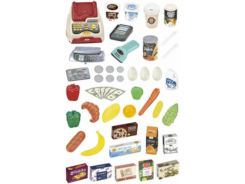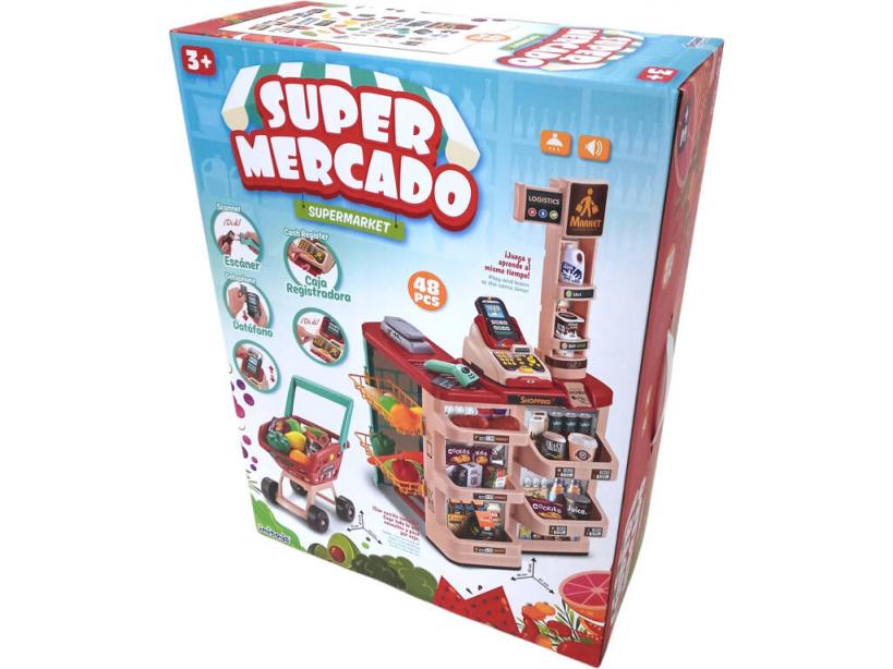 ¡Descubre el nuevo y completo Supermercado con Carrito 48 Piezas Accesorios! ¡Una nueva zona de juegos para los más peques!Llévate a casa este nuevo supermercado de juguete, lleno de zonas de juegos y accesorios, con los que desarrollar un día genial de trabajo en el supermercado del barrio. Junto al supermercado se incluye un práctico carrito de la compra y un gran número de accesorios con los que completar tus estanterías del super.Edad recomendada: + 3 años.Incluye: 1 supermercado con caja registradora, datáfono, pesa, lector de códigos, cestas laterales, estanterías delanteras y muchas más zonas de juego, 1 carrito de la compra, 1 tarjeta de crédito, 3 huevos, 1 bote de leche, 1 bote de zumo de naranja, 1 vaso de café, 1 plátano, billetes, monedas y muchos más accesorios de juego.Medidas aproximadas del supermercado: 82 cm de alto, 48 cm de ancho y 41 cm de fondo.Medidas aproximadas del carrito: 40,5 cm de alto, 20 cm de ancho y 33 cm de largo.El datáfono funciona con 2 pilas «AG13» (incluidas sólo para demostración)Puede encontrar las pilas y bateríasEl escáner funciona con 2 pilas «AAA» (no incluidas)Puede encontrar las pilas y bateríasLa caja registradora funciona con 2 pilas «AA» (no incluidas)Puede encontrar las pilas y baterías