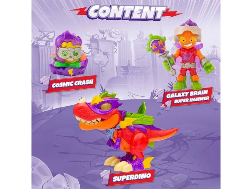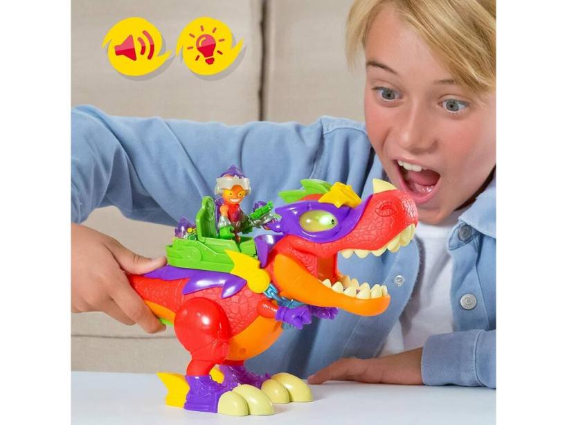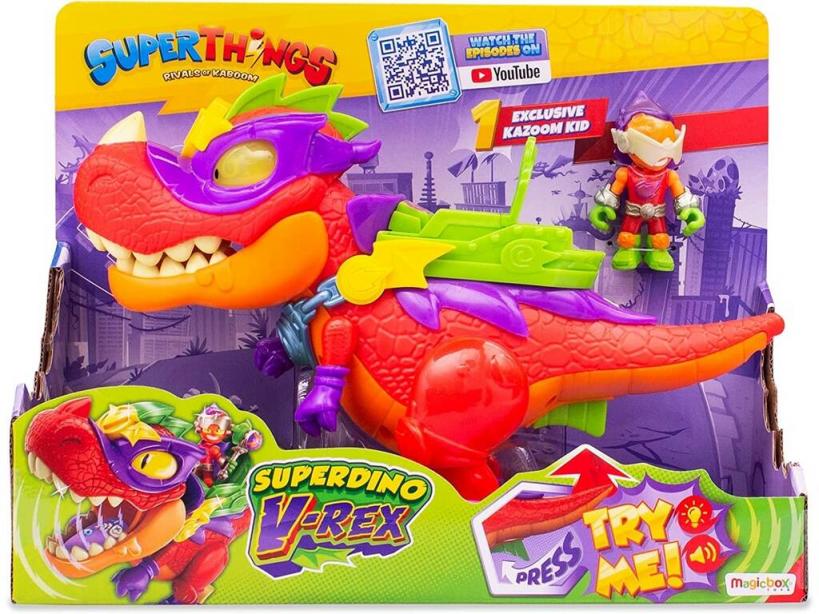 ¡Prepárate para la llegada de un ser brutal y alucinante a la ciudad de Kaboom! ¡Al hacerte con este Superthings Superdino V-Rex de Magic Box!Disfruta de la magia de este imponente dinosaurio articulado, con botón que activa sus mandíbulas, sonidos brutales y luces de acción. Acompaña al valiente Kazoom Kid en sus nuevas aventuras a bordo del V-Rex, así como otras sorpresas incluidas en el pack.Edad recomendada: 3 años o más.Colección: Superthings Rivals Of Kaboom.Incluye: 1 dinosaurio Superdino V-Rex con botón de ataque, luces y sonidos de acción, 1 muñeco articulado exclusivo Kazoom Kid, 1 figura exclusiva Cosmic Crash y 1 accesorio exclusivo para el muñeco.Medidas aproximadas del dinosaurio: 20 cm de alto, 12 cm de ancho y 28 cm de largo.Medidas aproximadas del muñeco: 7,5 cm de alto, 4,5 cm de ancho y 2,5 cm de fondo.Medidas aproximadas de la figura: 2,5 cm de alto, 2,5 cm de ancho y 1 cm de fondo.Los sonidos y luces del dinosaurio funcionan con 2 pilas «AAA» (incluidas sólo para demostración)Puede encontrar las pilas y baterías