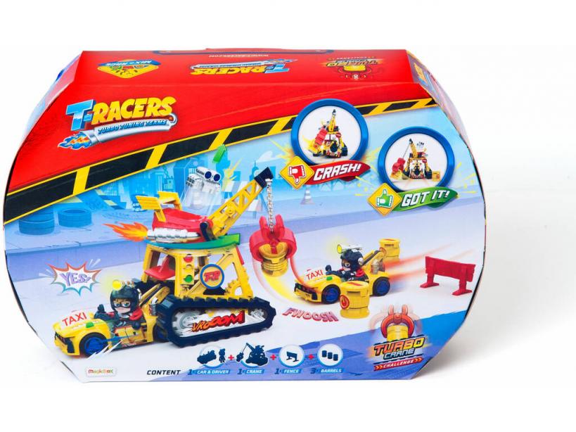 ¡Esquiva obstáculos y llega la meta junto a este genial piloto! ¡Consigue este nuevo playset T-Racers Turbo Crane de Magic Box!Disfruta de un nuevo reto junto a uno de los pilotos más populares de la ciudad, monta en su coche, esquiva los obstáculos y pasa por debajo de la grúa para hacer saltar por los aires al robot. Los vehículos T-Racers son peculiares por todas sus opciones de creación, hazte con un gran número de ellos y combina sus piezas hasta conseguir la mezcla perfecta para tener un coche campeón.¡Crea momentos únicos en Turbo City junto a los peques y los pilotos más locos! ¡Un sin fin de posibilidades de creación en vehículos de carreras fascinantes!Edad recomendada: + 3 años.Incluye: 1 piloto con vehículo exclusivo, 1 grúa, 1 valla y 3 barriles.Medidas aproximadas de la caja: 19 cm de alto, 29 cm de ancho y 7 cm de fondo.-> ->