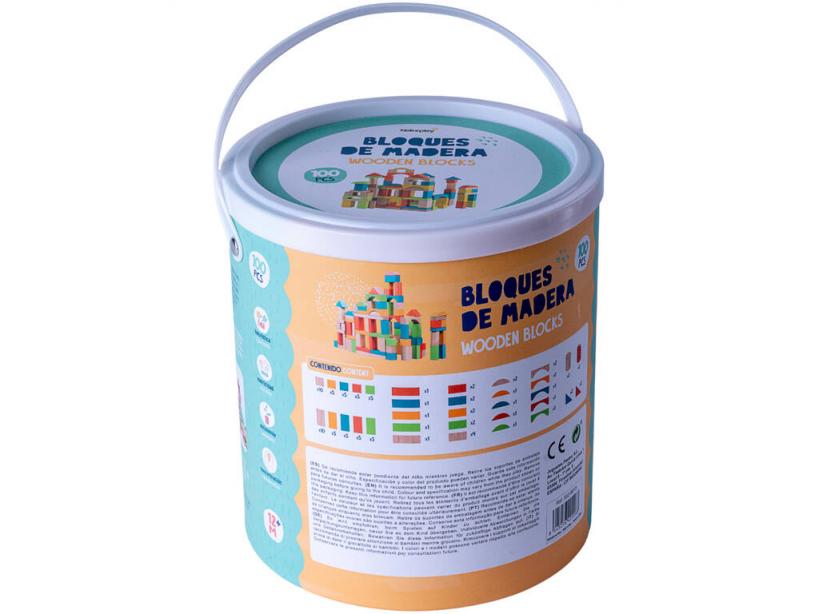 ¡Juega y aprende construyendo! ¡Gracias a este nuevo juego Bloques Madera 100 Piezas Madera!Con este fantástico cubo de bloques de madera, con el que los más pequeños se divertirán construyendo y jugando con las diferentes formas que contiene. Pondrán a prueba su imaginación y aprenderán a colocar las piezas unas encima de otras para que no se derrumben sus creaciones.Es perfecto para fomentar la creatividad de los más pequeños en sus priemeras etapas de crecimiento, ya que les ayudaran a fortalecer sus habilidades motrices y mejorar su concepción del equilibrio y la gravedad.Después de jugar el cubo sirve para recoger y almacenar todas las piezas.Cada pieza está elaborada por madera resistente de alta calidad, y pintada de colores vivos.Están fabricadas con madera de la mejor calidad, tienen una textura agradable al tacto y suave para los niños.Edad recomendada: 12 meses o más. Número total de piezas: 100 piezas de madera con diferentes formas y colores (cubos, rectángulos, cilindros, triángulos, y más formas). Medidas aproximadas del cubo con asa: 21,5 cm de alto, 19,5 de ancho, 19,5 de fondo.Peso aproximado del cubo con todas las piezas: 1.55 kg.