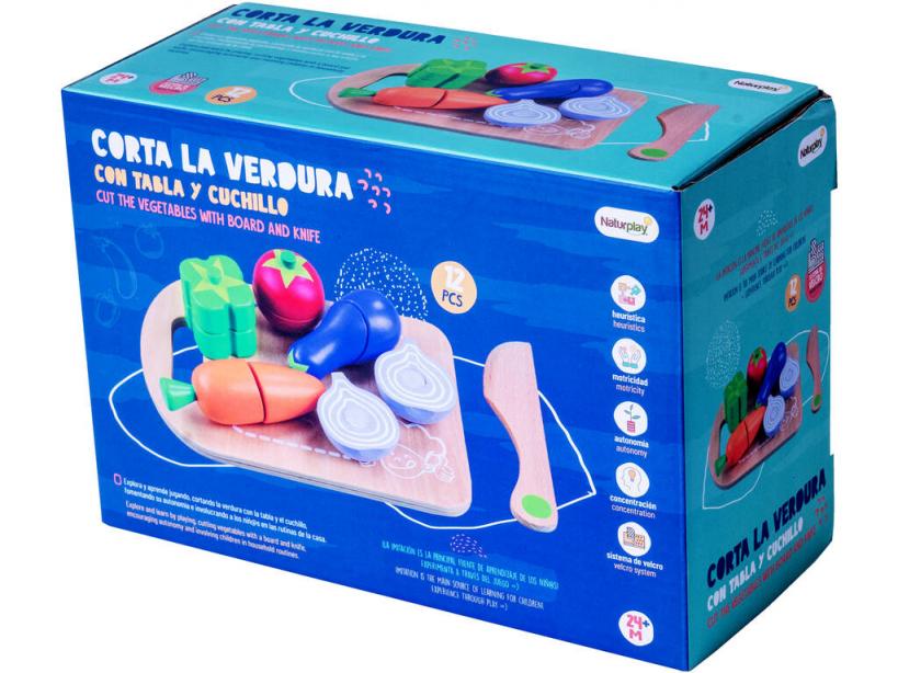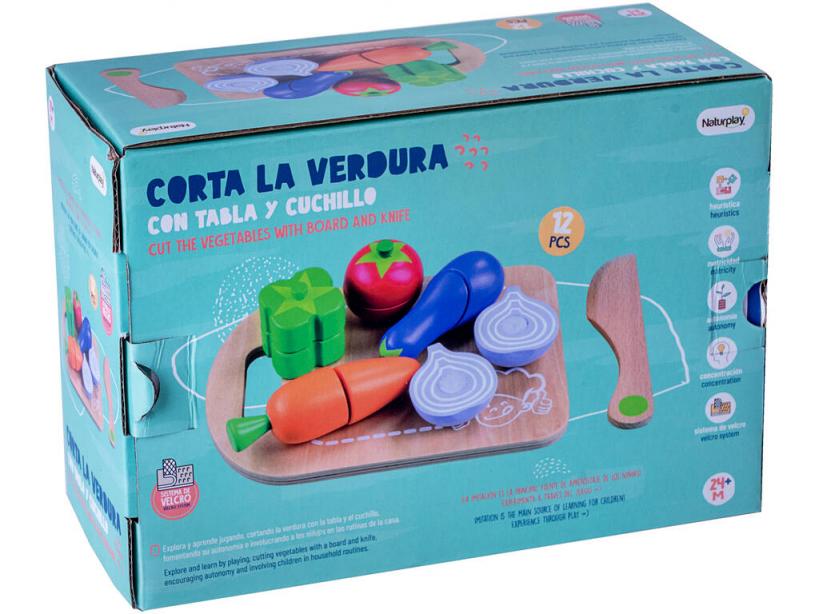 ¡Ayuda a los peques a aprender jugando gracias a artículos tan geniales como esteCorta La Verdura con Tabla y Cuchillo Madera de NaturPlay!Consigue este genial pack lleno de verduras de madera, coloridas, ligeras y sólidas piezas con formas muy reconocibles y una práctica pieza adhesiva que permite a los peques simular que las cortan, y las vuelven a unir para jugar de nuevo. Un juguete muy especial para los peques, pues a través del juego simbólico, les ayuda a desarrollar habilidades de lo más necesarias como la expresión verbal, mejorar la escritura, desarrollar la imaginación, aumentar la capacidad de concentración y sobre todo fomenta el juego y el aprendizaje autónomo.¡El regalo ideal para que los peques puedan disfrutar de un juguete que nunca pasa de moda! ¡Aprender jugando deja huella y sin duda artículos como este les ayuda a conocer algunas rutinas de la casa como la preparación y el cocinado de los alimentos!Edad recomendada: 2 años o más.Colección: NaturPlay.Número total de piezas: 12 piezas.Incluye: 1 tabla de cortar de madera con asa de mano, 1 cuchillo cortador de madera, 1 tomate de madera de 2 piezas con unión adhesiva, 1 zanahoria de madera de 2 piezas con unión adhesiva, 1 pimiento de madera de 2 piezas con unión adhesiva, 1 berenjena de madera de 2 piezas con unión adhesiva y 1 cebolla de madera de 2 piezas con unión adhesiva.Medidas aproximadas de la tabla: 0,9 cm de alto, 19,7 cm de ancho y 13,8 cm de fondo.Medidas aproximadas del tomate completo: 4,5 cm de alto y 4,5 cm de diámetro.Medidas aproximadas del cuchillo: 14 cm de largo, 3,2 cm de ancho y 0,6 cm de fondo.Peso aproximado de la tabla: 112 gramos.