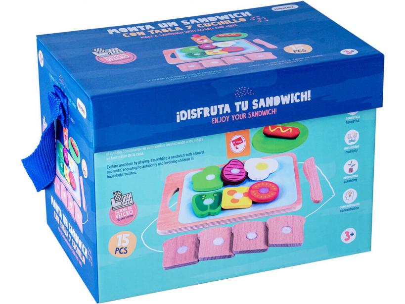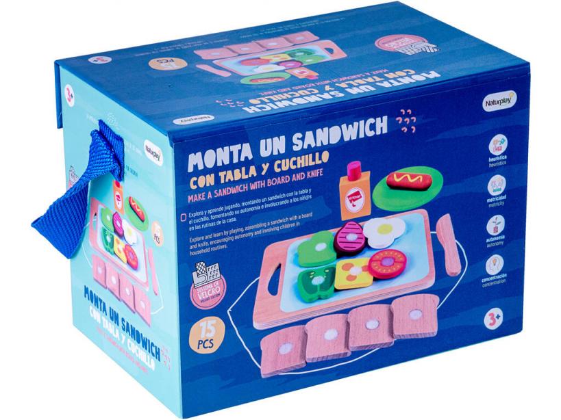 ¡Explora, aprende y deja volar la imaginación más creativa! ¡Junto al nuevo pack Monta Un Sandwich Madera con Tabla y Cuchillo de NaturPlay!Hazte con este práctico juguete de madera con el que los peques de la casa podrán disfrutar de horas del juego autónomo de imitación más genial, a la vez que adquieren un sin fin de destrezas de lo más útiles para el día a día. Ahora podrán crear sus sándwiches preferidos, mezclando ingredientes sobre la tabla de trabajo y mucho más. ¡Un modo de juego que les ayuda a desarrollar habilidades como la motricidad fina, la concentración, la imaginación y mucho más!Juguete fabricado con madera ligera y resistente, con el tamaño ideal para las manitas de los más peques de la casa. Materiales seguros, con sistema adhesivo para poder darle aún más realismo al juego más imaginativo.Edad recomendada: 3 años o más.Colección: NaturPlay.Número total de piezas: 15 piezas.Incluye: 1 tabla de cortar de madera con asa de mano, 1 cuchillo cortador de madera, 4 rebanadas de pan de madera con pieza adhesiva, 1 plato de madera verde, 1 bote de ketchup de madera, 1 salchicha de madera, 1 rodaja de tomate con pieza adhesiva, 1 rodaja de pimiento con pieza adhesiva, 1 loncha de queso con pieza adhesiva y más piezas de madera.Medidas aproximadas de la tabla: 0,6 cm de alto, 17,8 cm de ancho y 12,5 cm de fondo.Medidas aproximadas de cada rebanada de pan: 5,8 cm de largo, 5,5 cm de ancho y 0,6 cm de fondo.Medidas aproximadas del cuchillo: 12 cm de largo, 2,3 cm de ancho y 0,8 cm de fondo.Medidas aproximadas de la caja de almacenaje: 14 cm de alto, 19 cm de ancho y 12 cm de fondo.Peso aproximado de la tabla: 60 gramos.