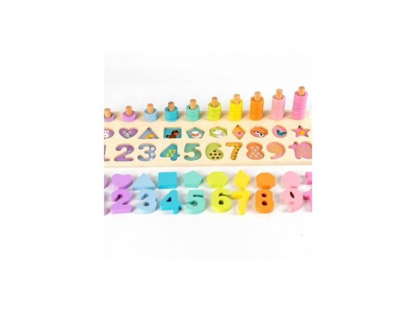 Gracias a este fabuloso Set de Madera Números y Formas Encajables, los más pequeños de la casa aprenderán a la vez que se divierten.Tanto la madera base, como cada una de las piezas de este fantástico set de madera, ha sido fabricado con los mejores materiales y de la más alta calidad. Una base de madera natural con 10 barras del mismo cono y espacios para colocar las piezas en el lugar correspondiente.Opción de números, con todos los números del 1 al 10, también en piezas de madera y cada una en diferentes colores en tono pastel. Figuras, con 10 figuras de formas diferentes y colores para encajar en el lugar correspondiente. Cuentas, cada una de las barras de un tamaño diferentes, tiene una arandela de madera en color diferente, los pequeños deberán introducir en cada una de ellas, las piezas correctas en el color correcto. Una manera de aprender y pasar las horas de una manera entretenida, con materiales de alta calidad.Edad recomendada: 3 añosIncluye: 76 piezas. Medida aproximada: 8 cm de alto, por 42 cm de ancho y 15 cm de fondo.