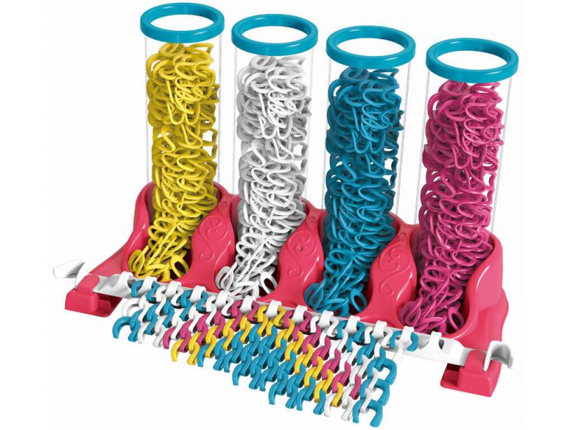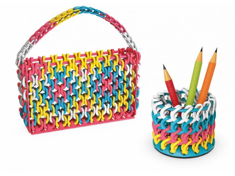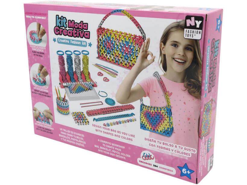 ¡Crea y diseña divertidos complementos! De la mano de este Kit moda creativa .Hora de sacar tu lado más creativo creando tus propios accesorios con este set, con el que podrás diseñar tus bolsos personalizados y espacio de trabajo creando portalápices y portavasos en variados tamaños e infinidad de combinaciones de colores. ¡Convierte tu cuarto en un gran taller de diseño!Encuentra en nuestra web un amplio surtido de artículos con los que podrás crear otro tipo de complemtos como collares y pulseras.Colección: NY Fashion ToysEdad recomendada: 6 años o más.Número total de engarces: 384 engarces.Incluye: una caja de almacenaje, una base para engarzar, un espacio para almacenar los engarces, engarces de color rosa, azul, blanco y amarillo, gomas elásticas y cierres.Medidas aproximadas de la caja de almacenaje: 27 cm de alto x 36 cm de ancho x 7 cm de fondo.
