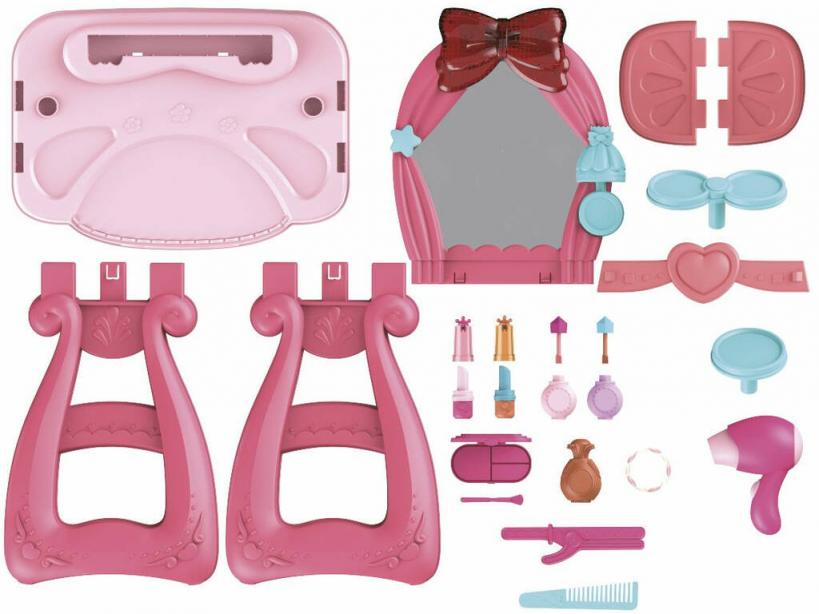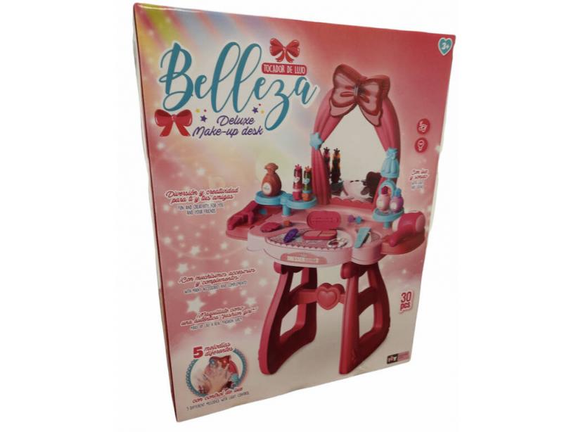 ¡Hora de ponerse guapos y guapas! ¡Gracias a este genial Tocador de Lujo Belleza con Accesorios!Diversión de lo más creativa de la mano de este fantástico tocador infantil de juguete, fabricado en plástico ligero y resistente, con diseño a todo color y una gran cantidad de accesorios con los que simular que cuidas tu pelo, rostro y mucho más. El tocador tiene luces y hasta 5 melodías diferentes, controla las luces como por arte de magia y refléjate en su espejo de juguete.Edad recomendada: + 3 años.Incluye: 1 tocador de lujo belleza con luz y sonido, 1 secador, 1 plancha, 1 peine, 2 pintalabios, 1 perfume y muchos más accesorios de juego.Medidas aproximadas del tocador: 65 cm de alto, 40 cm de ancho y 25 cm de fondo.Medidas aproximadas del secador: 13 cm de alto, 6 cm de ancho y 10 cm de largo.Funciona con 3 pilas «AA» (no incluidas)Puede encontrar las pilas y baterías