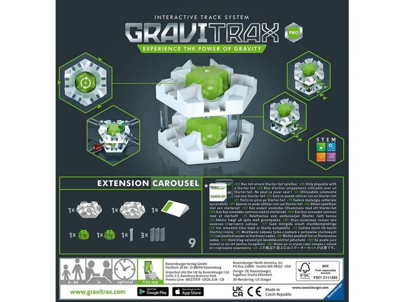 Escoge el Gravitrax Expansión Pro Carousel Ravensburger 27275 para darle los giros de sentido que tanto necesita tu circuito.Ha llegado el momento de mejorar el recorrido para tus canicas gracias a la gran variedad de giros que te ofrece este producto. ¡Dale sentido a tus canicas!El mundo de Gravitrax es innagotable y por ello Juguetilandia te trae las distintas posibilidades de ir mejorandolo con sus expasiones. ¡Conoce todas para escoger con cual quieres mejorar tu Starter Set.Edad recomendada: + de 8 años.Incluye: Un caja de almacenaje ilustrada, un Pro Carousel con varios accesorios y un manual de instrucciones de uso.Número de jugadores recomendado: + de 1 jugador.Duración aproximada de la partida: indeterminada.Medidas aproximadas de la caja de almacenaje: 19 cm de alto x 19 cm de ancho x 5 cm de fondo.Importante: Este pack de expansión solo se puede utilizar si dispones del Starter Set de Gravitrax que se vende por separado.