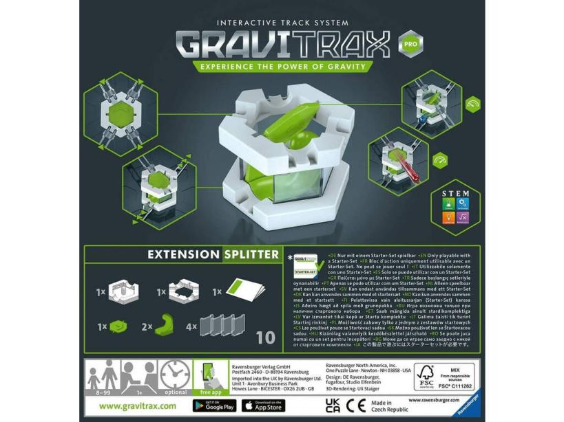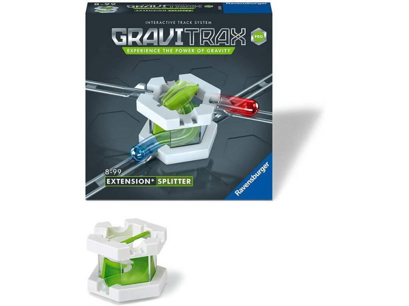 ¡Añade emoción y diversión a tus circuitos más geniales! ¡Gracias a este tan esperado set Gravitrax Pro Extensión splitter de Ravensburger!Consigue este nuevo pack que incluye piezas para añadir a tu circuito Gravitrax, un set con el que podrás cambiar la dirección de la bolita, aumentar y diseminar la velocidad a tu gusto. Escoge bien donde instalar esta extensión de pista y disfruta con un resultado impresionante. ¡Encuentra más extensiones y expansiones en nuestro amplio surtido web de artículos Gravitrax!Importante: Este pack de extensión solo se puede utilizar si dispones del Starter Set de Gravitrax que se vende por separado.Nota: Accesorios y canicas extra no incluidas en el pack, se venden por separado.Edad recomendada: + 8 años.Número de jugadores: 1 o más.Incluye: 1 caja de almacenaje ilustrada, 1 base, 1 pieza superior, 2 piezas curvas, 1 bandeja, 4 laterales transparentes e instrucciones en varios idiomas.Medidas aproximadas de la caja de almacenaje: 19 cm de alto, 19 cm de ancho y 5 cm de fondo.
