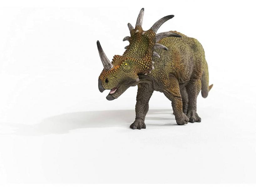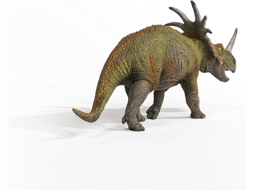 A pesar de la apariencia del Styracosaurus Schleich 15033, tienes que saber que es muy pacíficio y sociable. ¡Le encanta alimentarse de platas duras y verdosas!.Su cuerno tan característico y poderoso le hacer ser un arma de defensa para los depredaderos que quieran atacarle. Toda la fuerza que dispone recae sobre su cabeza y la suele utilizar para derribar grandes arboles y poder llevarlos al suelo y alimentarse. Dispone de un color verde y pequeñas manchas marrones, lo cual le hace poder camuflarse entre grandes árboles.Un gran cantidad de especies jurásicas están disponibles en Juguetilandia. Muevete por la sección correspondiente para hacerte con cualquiera que te llame la atención.Edad recomendada: + 3 años. Incluye: Una bolsa de almacenaje y un Styracosaurus.Medidas aproximadas de la bolsa de almacenaje: 24 cm alto x 14 cm de ancho x 5 cm de fondo.Medidas aproximadas del Styracosaurus: 12 cm de alto x 4 cm de ancho x 20 cm de fondo.