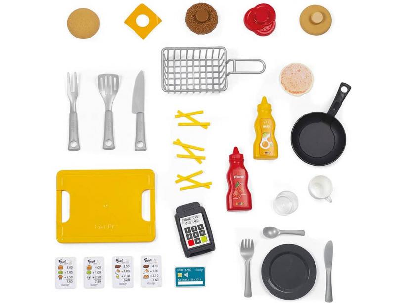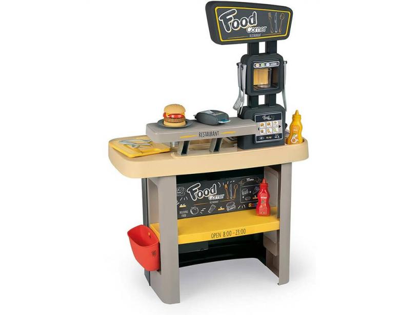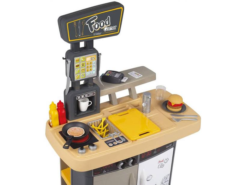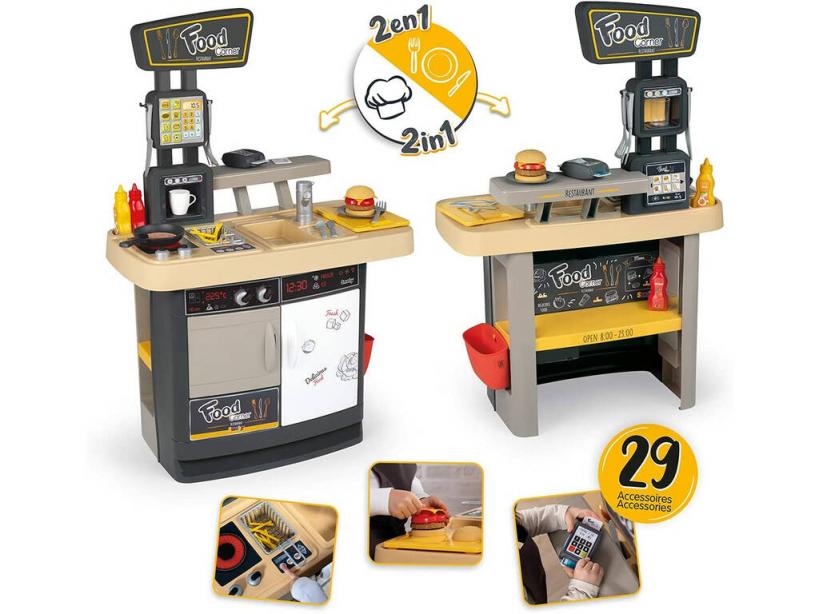 ¡Ponte manos a la obra y disfruta del Food Corner Restaurante Smoby 310910!. ¡Las horas pasan volando en la cocina!.Esta increíble cocina es el producto perfecto para desarrollar las funciones de trabajador o cliente ya que es 2×1. Por un lado podrás estar sirviendo a tus amigos todo lo que te pidan y en otro momento querrás hacer el pedido de comida tú y disfrutar de una buena comida mientras te sirven. Maneja desde tomar nota, cobrar el pedido con el datafono y preparar la comida en la sartén, a disfrutar de una buena hamburguesa en tu plato de comida con los cubiertos disponibles.En nuestra web podrás descubrir una amplia variedad de cocidas para pasar un buen rato haciendo lo que más te gusta. Preparado para descubrir todas las novedades y quererlas todas.Edad recomendada: + de 3 años.Incluye: Una caja de almacenaje ilustrada, un Food Corner Restaurante y 29 accesorios.Medidas aproximadas de la caja de almacenaje: 66 de cm alto x 59 de cm ancho x 25 de cm fondo.Medidas aproximadas de la cocina: 95 cm de alto x 63 cm de ancho x 38 cm de fondo.Fabricado en Francia.Qué te apetecerá ser. Trabajador o cliente.Nota: No funciona a pilas por lo que no tiene ninguna función electrónica el producto.