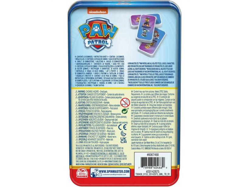 ¡Una nueva aventura llena de emoción y diversión os espera! ¡Gracias a este nuevo Patrulla Canina Dominó de Spin Master!Consigue esta genial versión de uno de los juegos de mesa preferidos por toda la familia, un dominó muy especial por su diseño de la Patrulla Canina a todo color. Protegido por una divertida lata con diseño especial, este juego es justo lo que buscas para jugar en todas partes, una oportunidad de oro para desarrollar habilidades a la vez que lo pasas en grande. ¡Piezas de máxima calidad con la imagen de Chase, Marshall y todos sus amigos!Edad recomendada: 4 años o más.Número de jugadores: De 2 a 4 jugadores.Colección: Paw Patrol.Incluye: 1 lata de almacenaje ilustrada y 28 piezas de dominó con diseño especial de los protagonistas de la Patrulla Canina.Medidas aproximadas de la lata de almacenaje: 19 cm de largo, 11,5 cm de ancho y 3 cm de fondo.