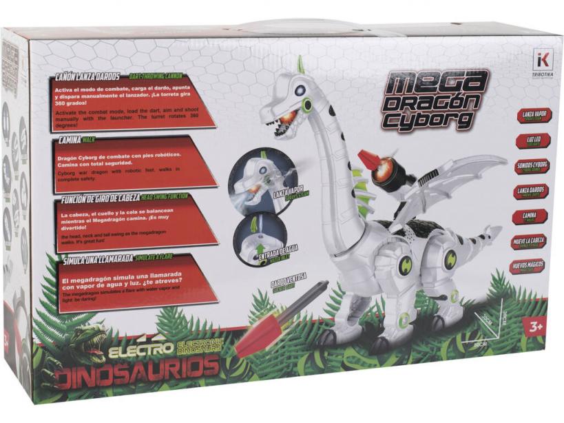 ¡Ten en tus manos el poder de un ser imposible e impresionante! ¡El asombroso Mega Dragón Cyborg Caminante con Luz y Sonidos!Consigue este impresionante dinosaurio dragón con un aspecto cibernético muy espectacular, que además, es capaz de caminar, emitir sonidos de acción e incluso una luz. También, para darle más emoción a las horas de juego, el juguete es capaz de lanzar un proyectil a sus enemigos y tiene un impresionante efecto llamarada ya que es capaz de simular que lanza vapor. Solo has de llenar su depósito de agua y comenzar la diversión.Edad recomendada: + 3 años.Incluye: 1 dinosaurio Mega Dragón Cyborg caminante con luces y sonidos de acción, 2 dardos y 4 huevos de dragón.Medidas aproximadas del dinosaurio: 30 cm de alto, 14 cm de ancho y 50 cm de largo.Funciona con 2 pilas «AA» (no incluidas)Puede encontrar las pilas y baterías
