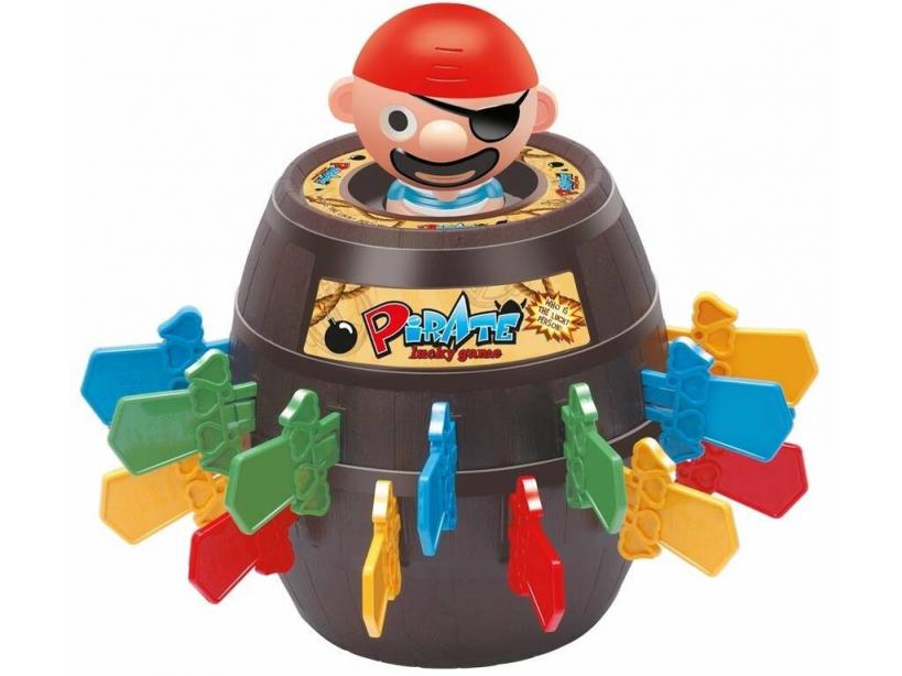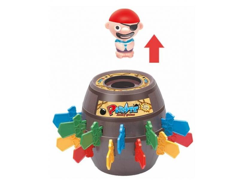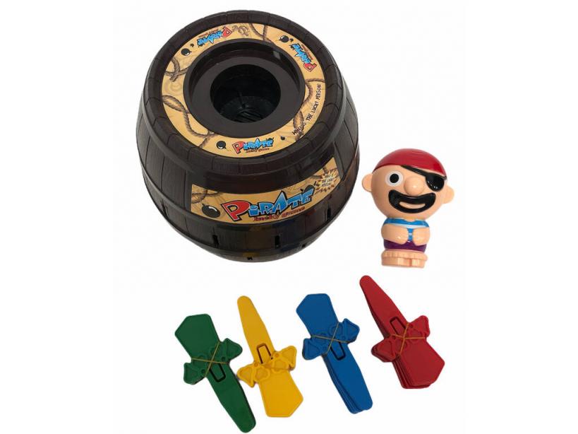 Activa la trampilla y Caza al Pirata con este divertido juego de mesa.Fabricado en plástico de gran calidad, este barril es de color marrón con detalles como si fuera madera, en el que tienes que introducir las espadas también de plástico, de color rojo, amarillo verde y azul. En el orificio de la parte superior tienes que introducir a la figura pirata de plástico que viene incluido con su camiseta de rayas, su parche en el ojo y su pañuelo en la cabeza de color rojo.Reúne a tus amigos y amigas, coloca el barril en el centro de la mesa, reparte a cada jugaor las 6 espadas del color elegido y que empiece la diversión. Cada uno de los jugadores debe de insertar su espada en la rendija del barril, pero si uno de los jugadores introduce la espada en la rendija equivocada, activará el mecanismo que hace que el pirata salte por el aire, haciéndole perder la partida.¡Ron, ron, ron la botella de ron!Un juego de estrategia con el que sin duda podrá jugar toda la familia y con el que os lo pasareis en grande.Edad recomendada: + 3 años.Incluye: 1 barril, 1 figura pirata y 24 espadas de plástico (6 rojas, 6 amarillas, 6 verdes y 6 azules).Número de jugadores: De 1 a 4 jugadores.Medidas aproximadas del barril: 21 cm de alto, 19 cm de ancho y 19 cm de fondo.Medidas aproximadas del pirata: 12,5 cm de alto, 10 cm de ancho y 7,5 cm de fondo.Medidas aproximadas de cada espada: 12 cm de largo, 5,8 cm de ancho y 0,5 cm de fondo.