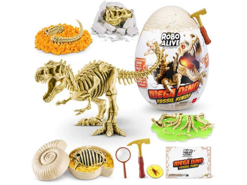 ¡Prepara tu mejor look de paleontólogo y disfruta de la aventura! ¡Junto al nuevo Robo Alive Mega Dino Fossil Huevo Sorpresa de Zuru!Llévate a casa este impresionante mega huevo de dinosaurio y alucina con todas sus sorpresas, descubre los huesos de dinosaurio y construye tu propia figura con luz y sonidos de acción. Aprende un montón de información sobre los fósiles, disfruta de tatuajes alucinantes y juega con la arena y el slime incluido. ¡Todo en un mismo huevo gigante!Edad recomendada: 5 años o más.Colección: Robo Alive de Zuru.Incluye: 1 mega huevo de dinosaurio sorpresa con 1 fósil de dinosaurio sorpresa, 1 slime de magma, 1 slime de magma esponjoso, 1 fósil, 1 arena, 1 herramienta, 3 calcomanías color ámbar, 1 lupa, 1 póster y 1 manual de instrucciones.Medidas aproximadas del huevo sorpresa: 30 cm de alto, 22 cm de ancho y 17 cm de fondo.Funciona con 3 pilas «LR44» (incluidas sólo para demostración)Puede encontrar las pilas y baterías